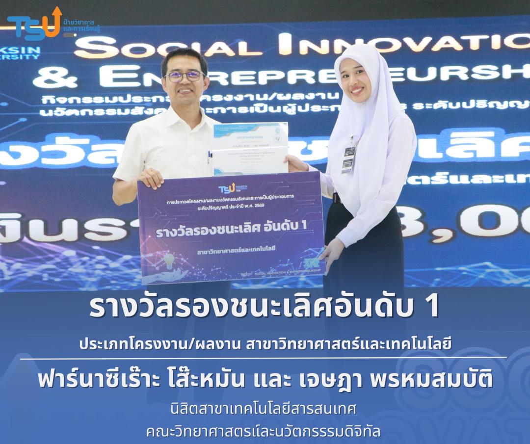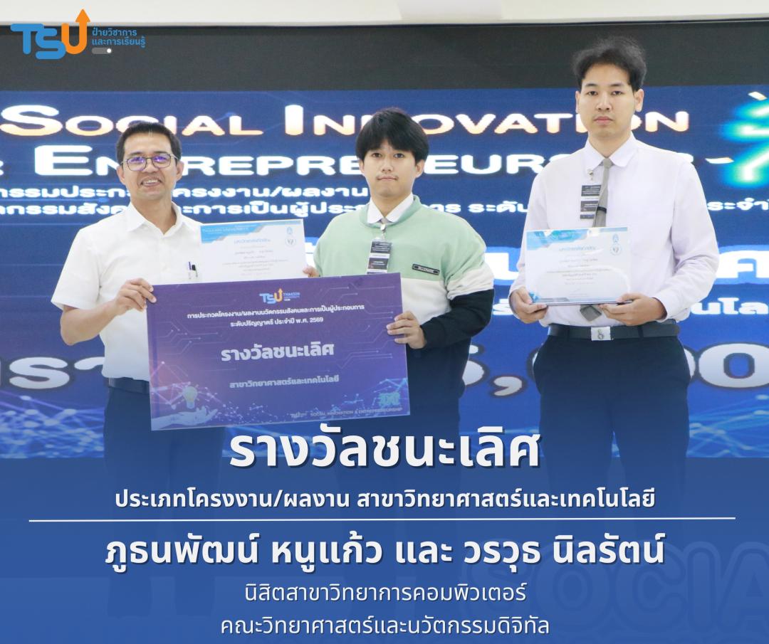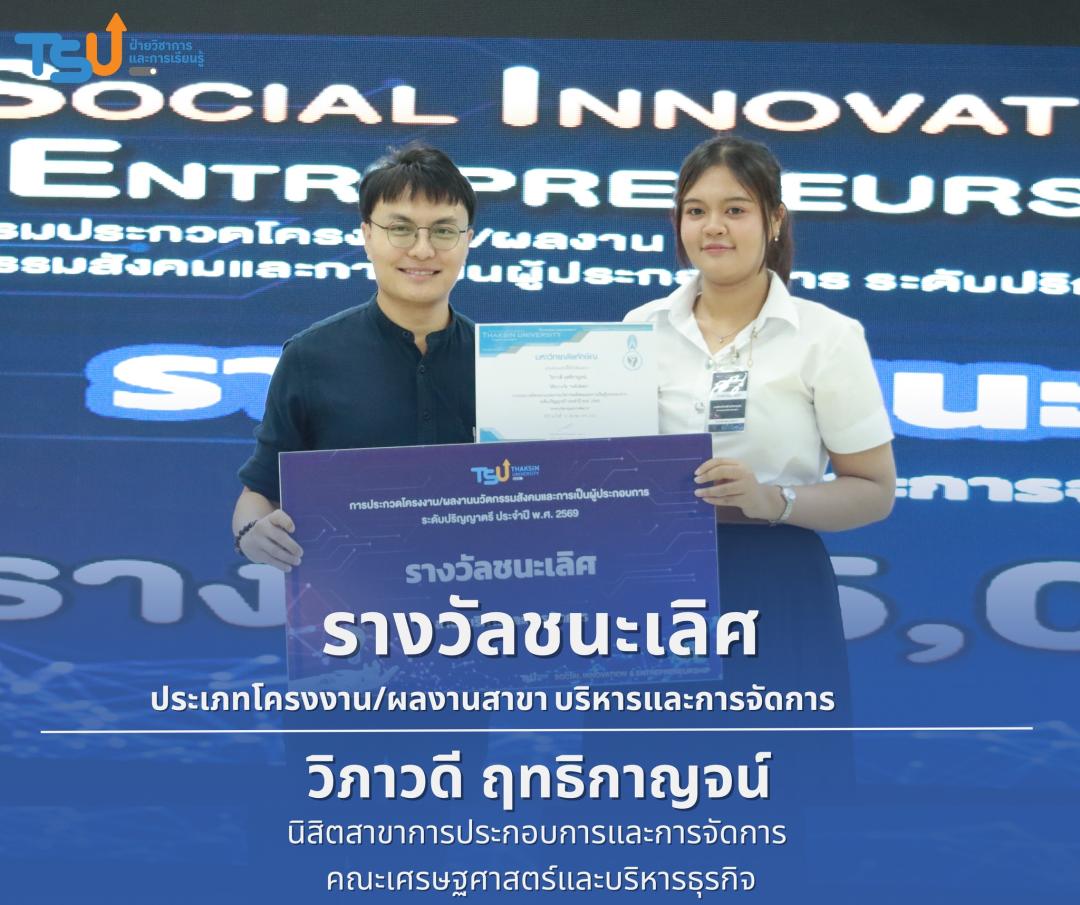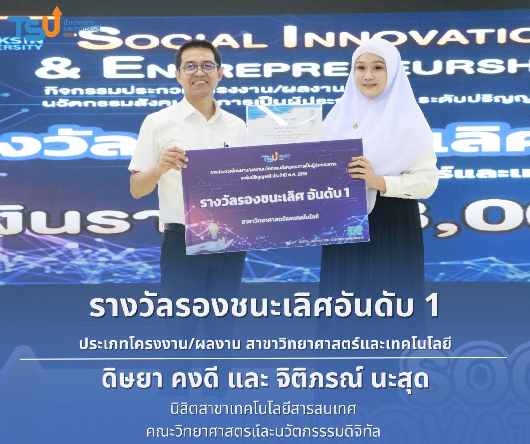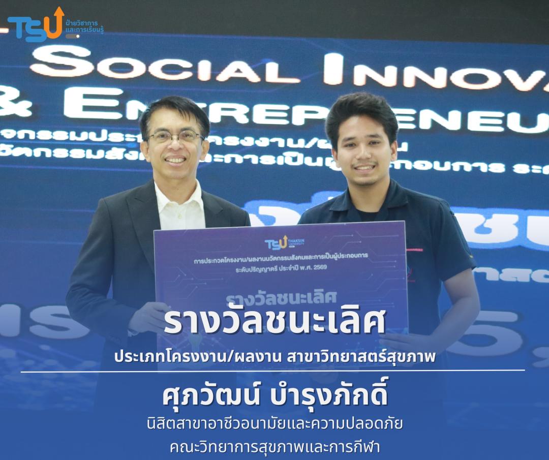 มหาวิทยาลัยทักษิณ ขอแสดงความยินดีกับนิสิตที่ได้รับรางวัลจากการประกวดโครงงาน/ผลงานนวัตกรรมสังคมและการเป็นผู้ประกอบการ ระดับปริญญาตรี ประจำปี พ.ศ. 2569 ซึ่งเป็นเวทีที่เปิดโอกาสให้นิสิตได้แสดงศักยภาพทางวิชาการ ความคิดสร้างสรรค์ และทักษะการพัฒนานวัตกรรม เพื่อนำองค์ความรู้ไปประยุกต์ใช้ในการแก้ไขปัญหาและพัฒนาสังคมได้อย่างเป็นรูปธรรม