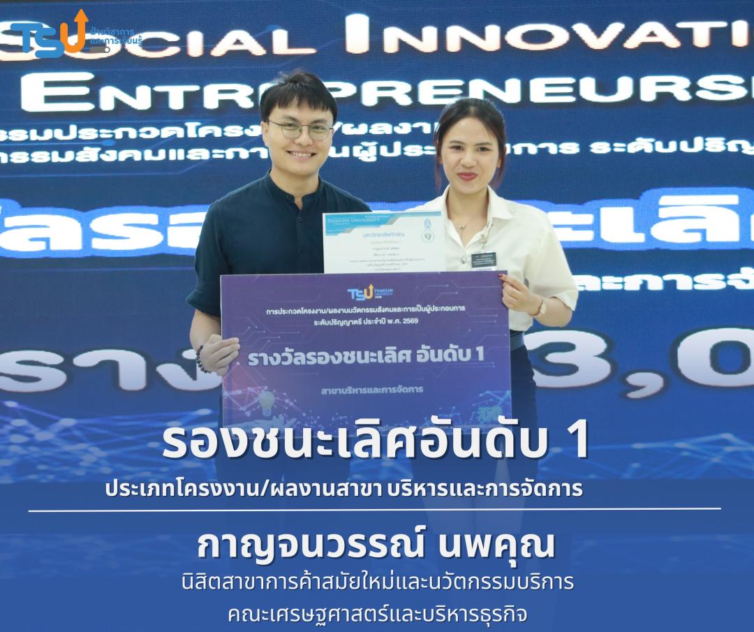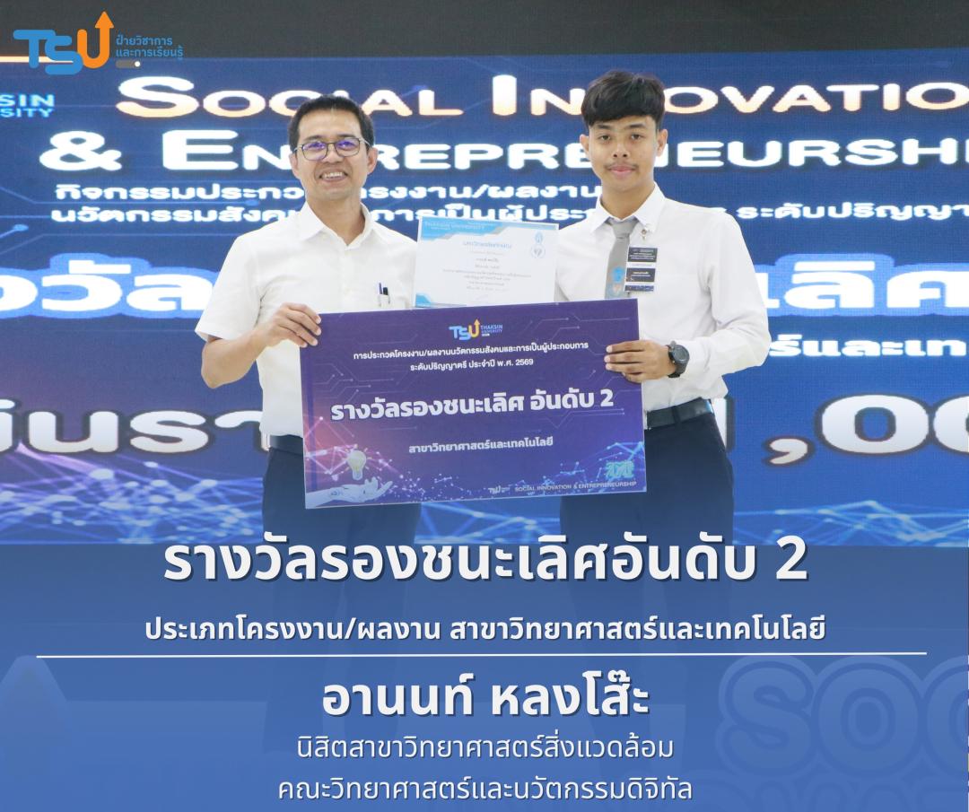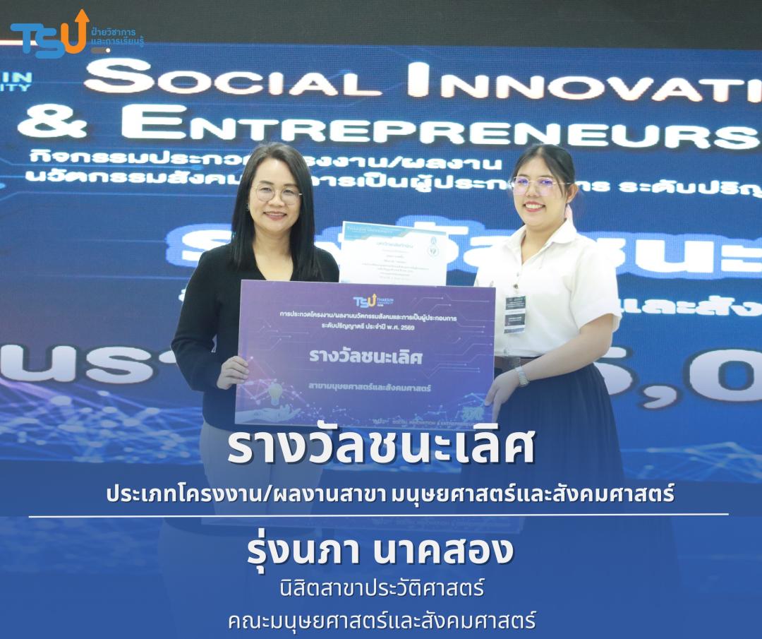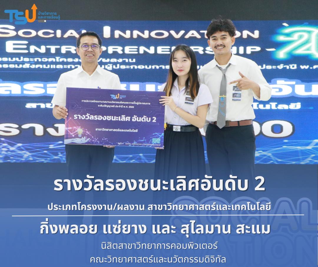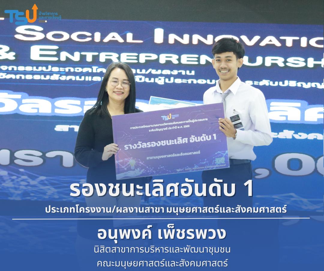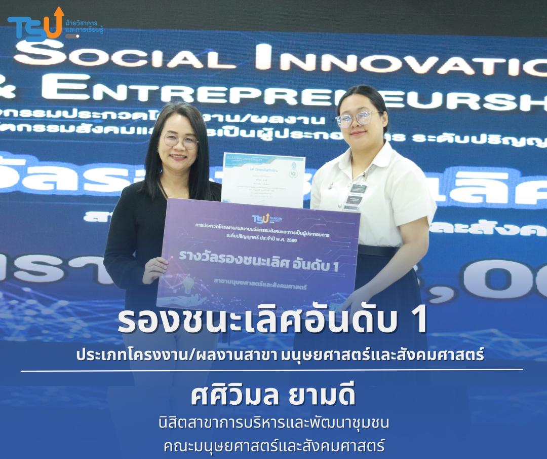 มหาวิทยาลัยทักษิณ ขอแสดงความยินดีกับนิสิตที่ได้รับรางวัลจากการประกวดโครงงาน/ผลงานนวัตกรรมสังคมและการเป็นผู้ประกอบการ ระดับปริญญาตรี ประจำปี พ.ศ. 2569 ซึ่งเป็นเวทีที่เปิดโอกาสให้นิสิตได้แสดงศักยภาพทางวิชาการ ความคิดสร้างสรรค์ และทักษะการพัฒนานวัตกรรม เพื่อนำองค์ความรู้ไปประยุกต์ใช้ในการแก้ไขปัญหาและพัฒนาสังคมได้อย่างเป็นรูปธรรม