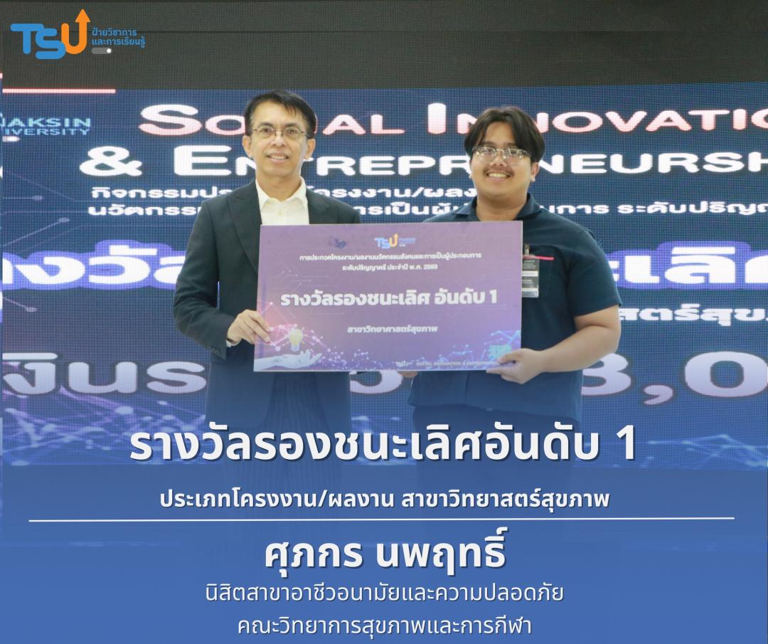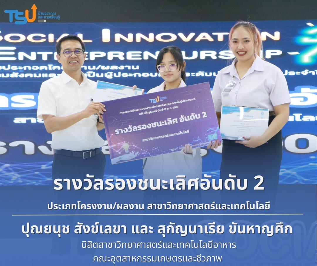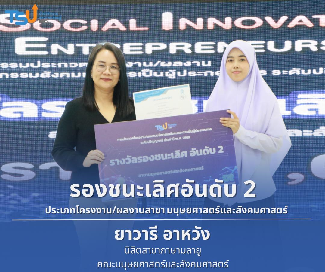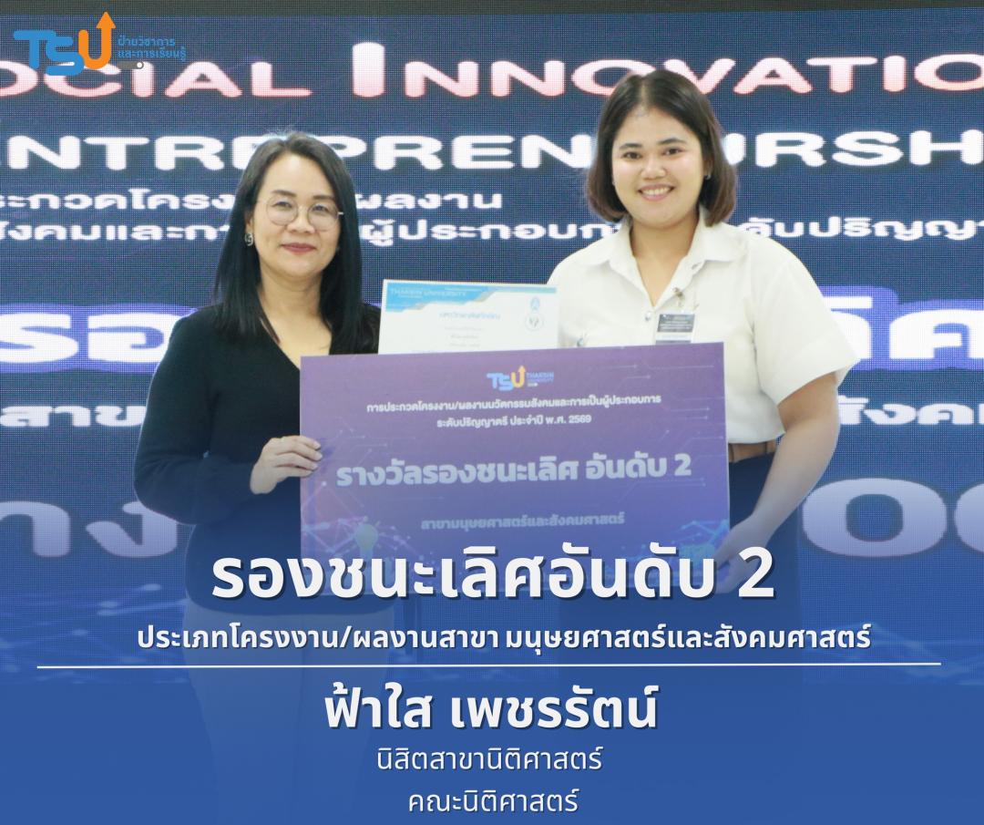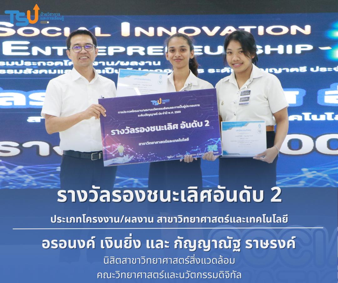 มหาวิทยาลัยทักษิณ ขอแสดงความยินดีกับนิสิตที่ได้รับรางวัลจากการประกวดโครงงาน/ผลงานนวัตกรรมสังคมและการเป็นผู้ประกอบการ ระดับปริญญาตรี ประจำปี พ.ศ. 2569 ซึ่งเป็นเวทีที่เปิดโอกาสให้นิสิตได้แสดงศักยภาพทางวิชาการ ความคิดสร้างสรรค์ และทักษะการพัฒนานวัตกรรม เพื่อนำองค์ความรู้ไปประยุกต์ใช้ในการแก้ไขปัญหาและพัฒนาสังคมได้อย่างเป็นรูปธรรม