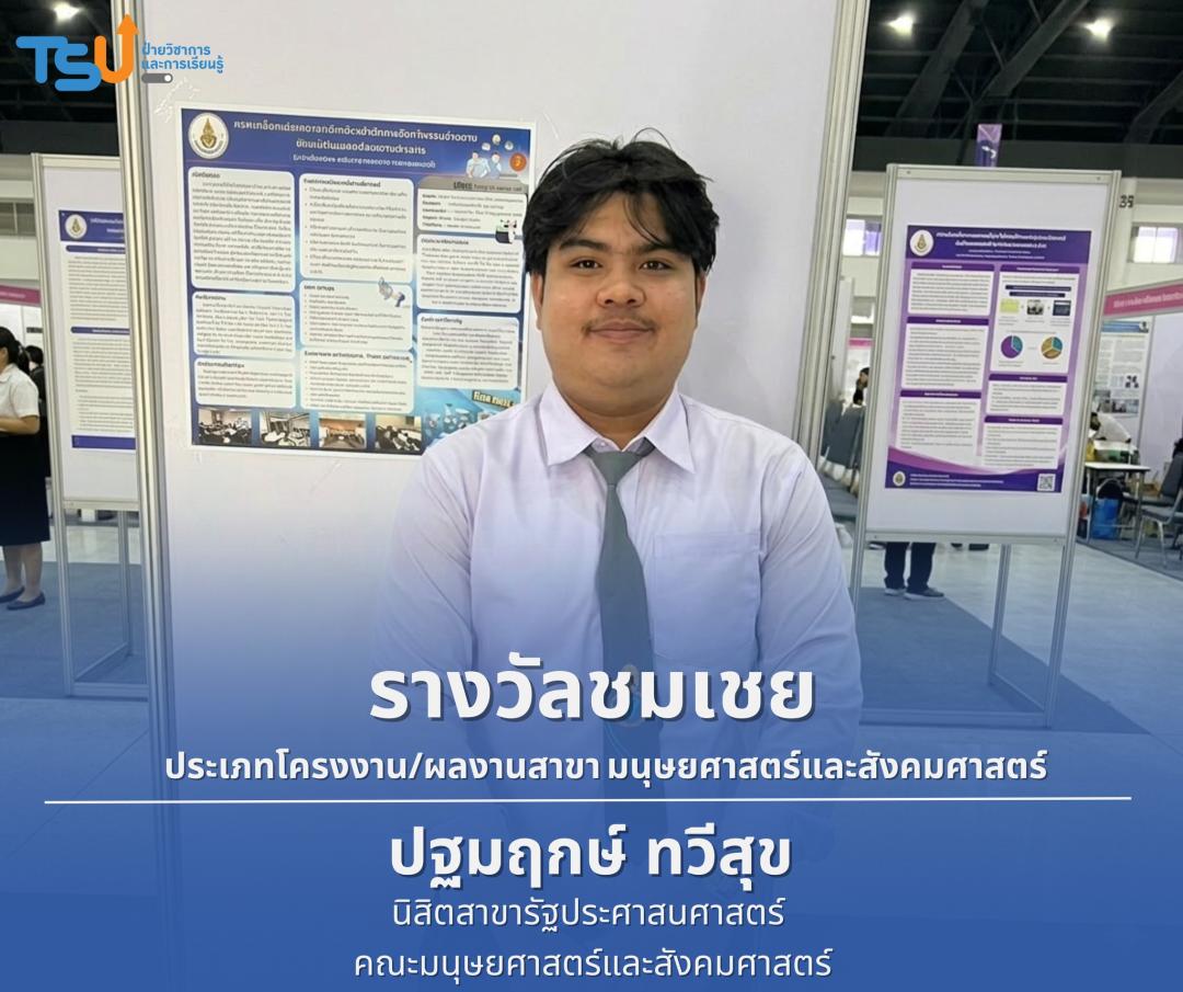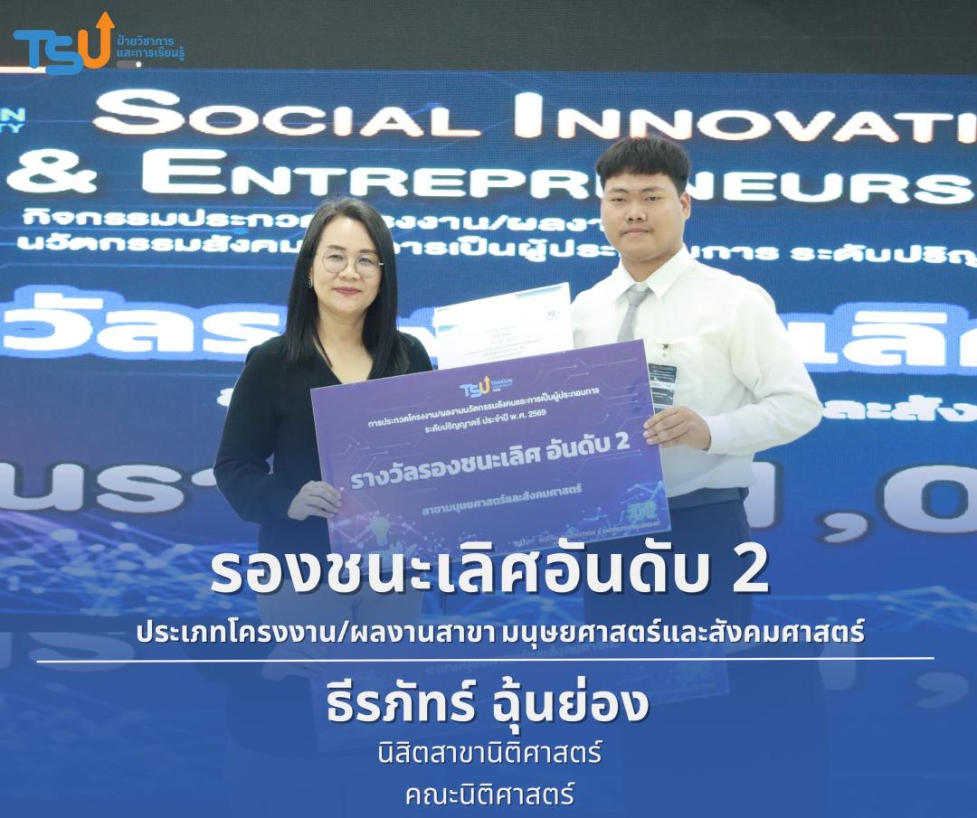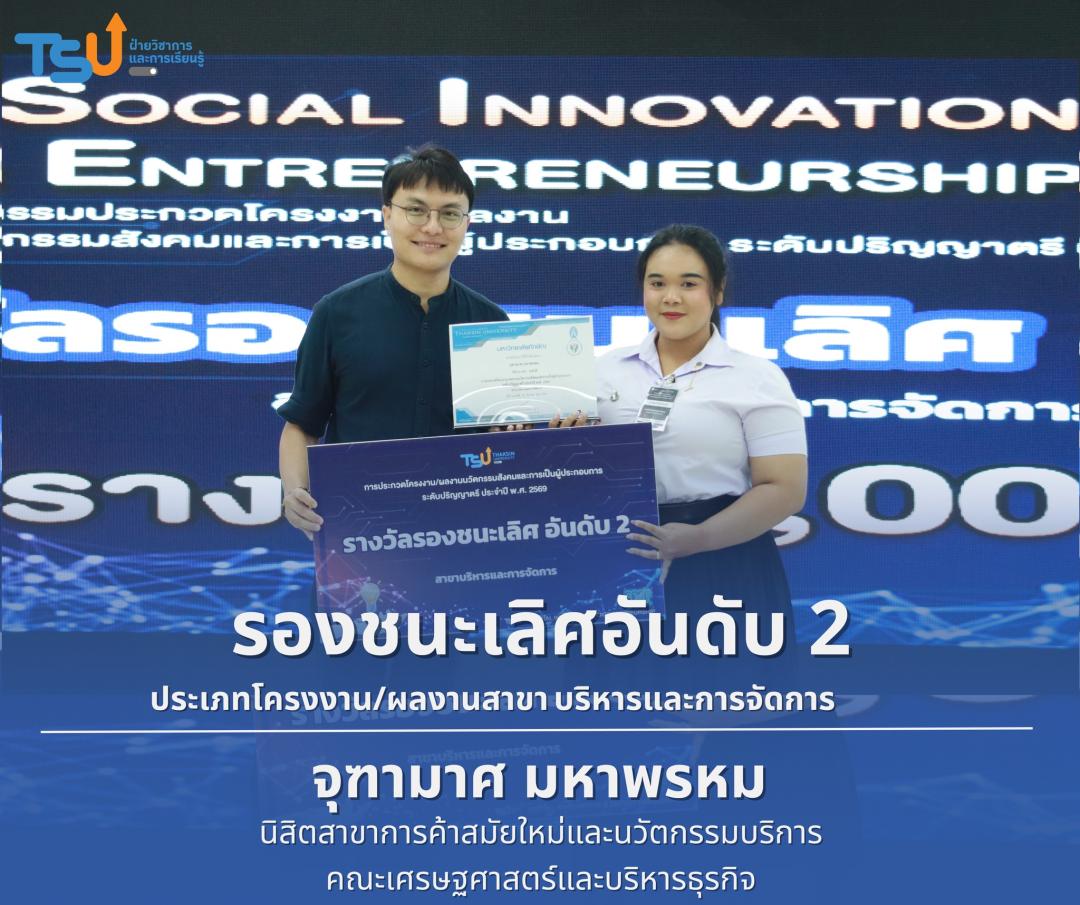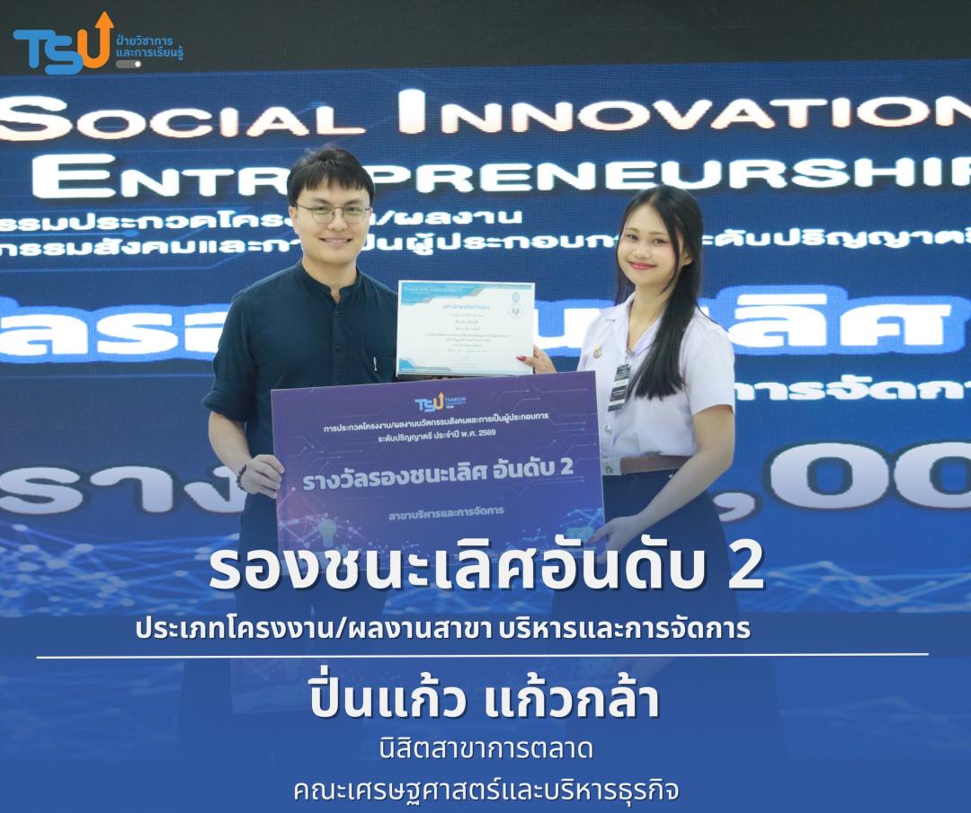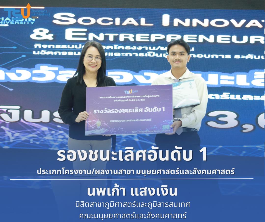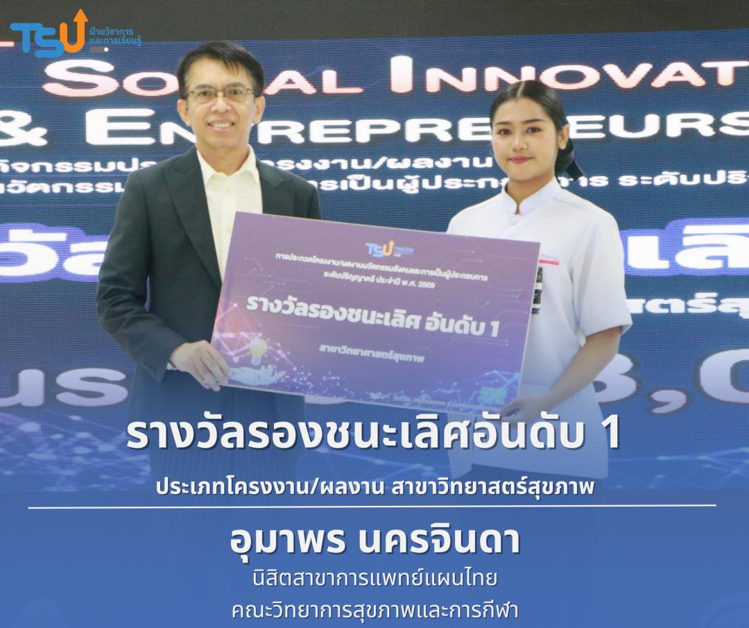 มหาวิทยาลัยทักษิณ ขอแสดงความยินดีกับนิสิตที่ได้รับรางวัลจากการประกวดโครงงาน/ผลงานนวัตกรรมสังคมและการเป็นผู้ประกอบการ ระดับปริญญาตรี ประจำปี พ.ศ. 2569 ซึ่งเป็นเวทีที่เปิดโอกาสให้นิสิตได้แสดงศักยภาพทางวิชาการ ความคิดสร้างสรรค์ และทักษะการพัฒนานวัตกรรม เพื่อนำองค์ความรู้ไปประยุกต์ใช้ในการแก้ไขปัญหาและพัฒนาสังคมได้อย่างเป็นรูปธรรม