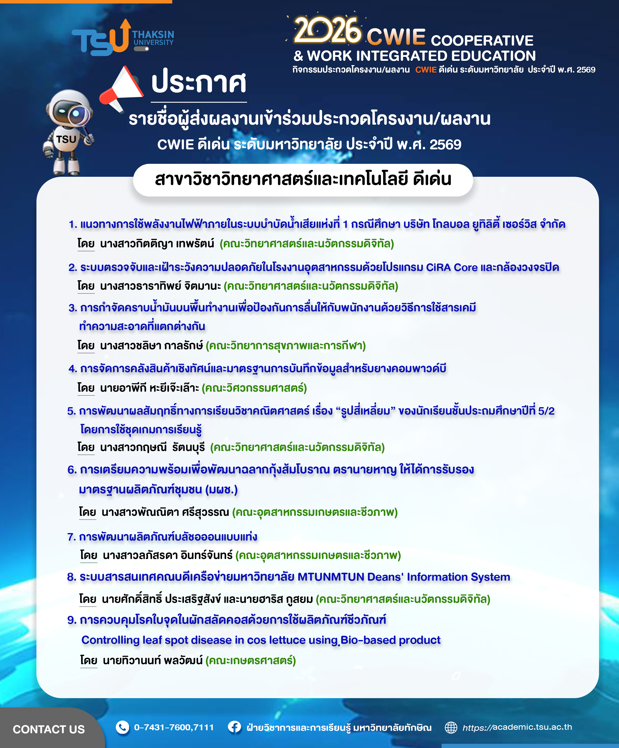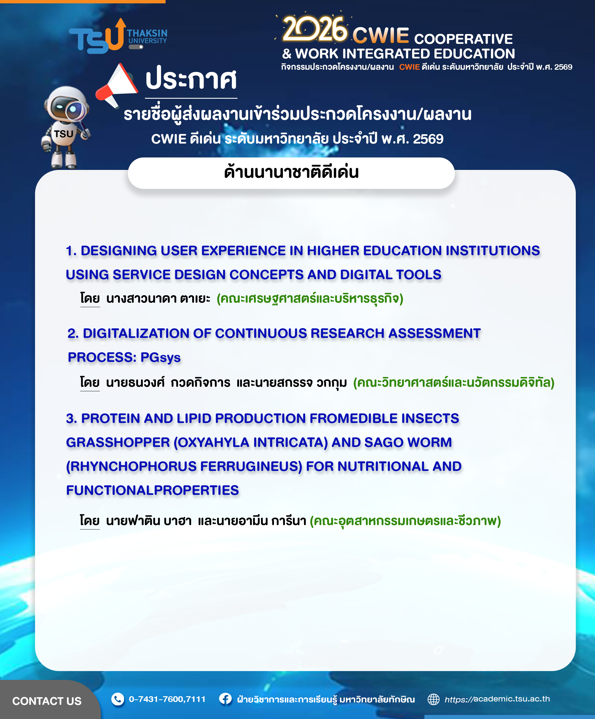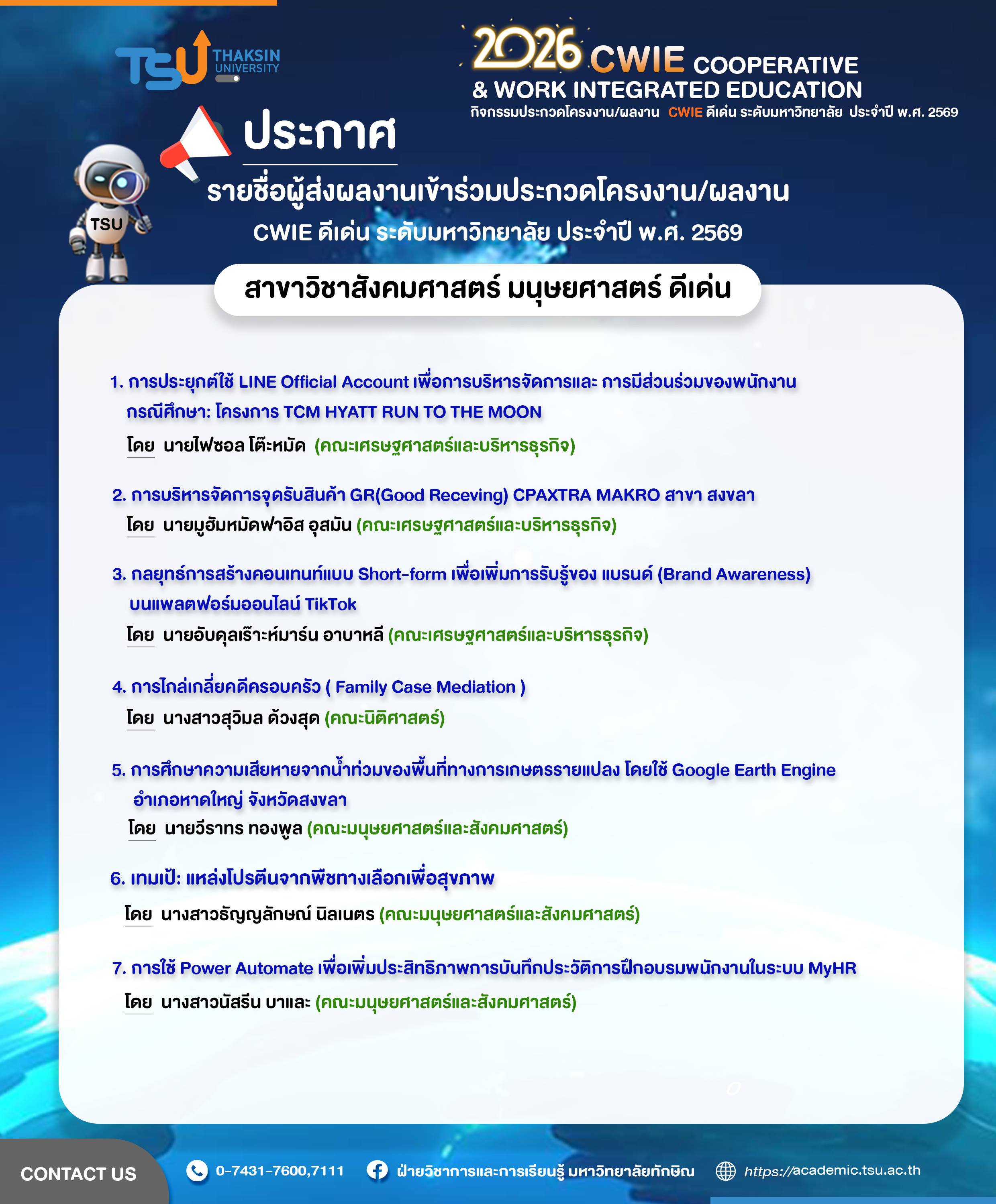 ประกาศรายชื่อผู้ส่งผลงานเข้าร่วมประกวดโครงงาน/ผลงาน CWIE ดีเด่น ระดับมหาวิทยาลัยทักษิณ ประจำปี พ.ศ. 2569
